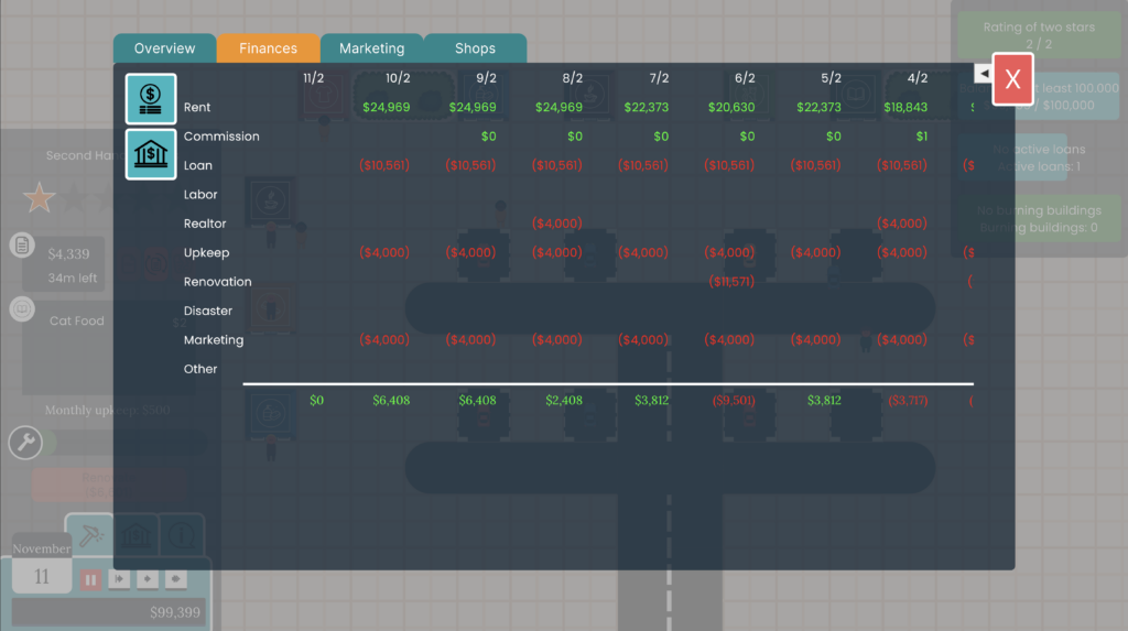 Optimize the layout of your mall, move walls, place restrooms and build a big parking lot for all your shoppers. Expand your mall and buy the property right next to your mall to welcome even more money spenders.